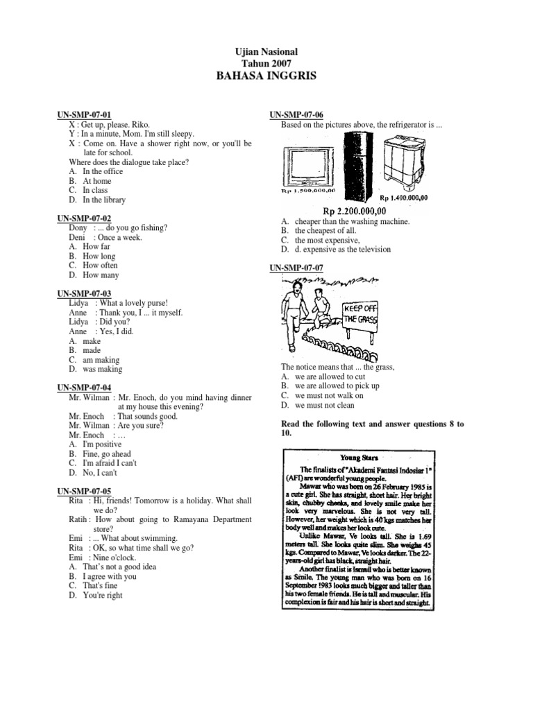 Download as docx, pdf, txt or read online from scribd. Jadwal ujian um ptkin dan contoh soal. Berikut ini adalah contoh soal ujian nasional mata pelajaran ipa smp yang bisa anda jadikan sebagai latihan persiapan menghadapi ujian nasional. Misalnya adalah penyesuaian ijazah sma ke ijaza s1 atau ke ijazah s2. 1 paket 1 contoh soal dan pembahasan matematika smp.